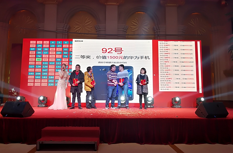 在總經(jīng)理的帶領下,冠能公司很多同事成了“花粉”,也就是華為的粉絲。2017年年會主題,就是借用的華為公司任總的話“不破樓蘭終不還”。我們也一直弘揚類似華為的奮斗者文化,讓跟隨公司共同奮斗發(fā)展的員工,有一個獲得認可的回報。奮斗者不一定成功,但成功者必定奮斗過,我們將繼續(xù)努力奮斗。在這幾年年會里,用于抽獎的獎品大部分都是華為產(chǎn)品。今年特等獎是5臺彩色電視機,一等獎是10臺華為PAD,二等獎是20臺華為手機,三等獎是40臺華為手環(huán),四等獎是60臺美的電火鍋。共計獎品135臺。在此,再次恭喜得獎的幸運朋友。